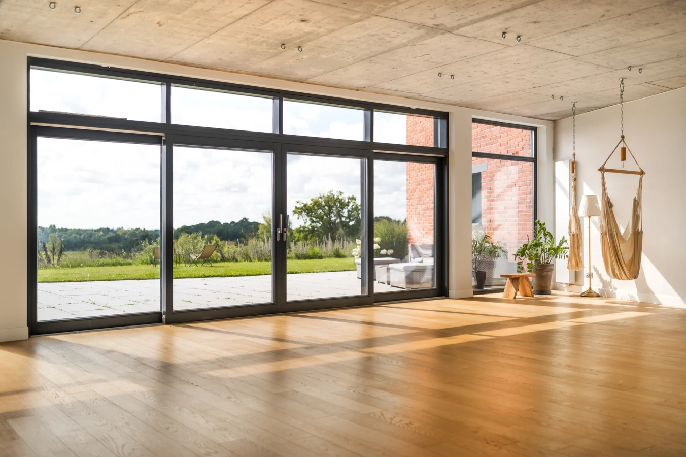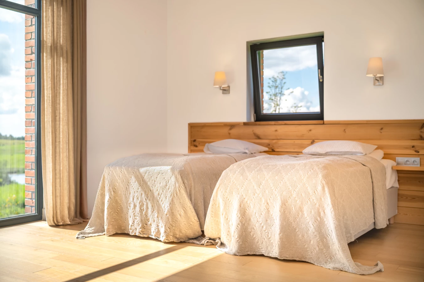 Duże okna z widokiem na łąkę, jezioro i las