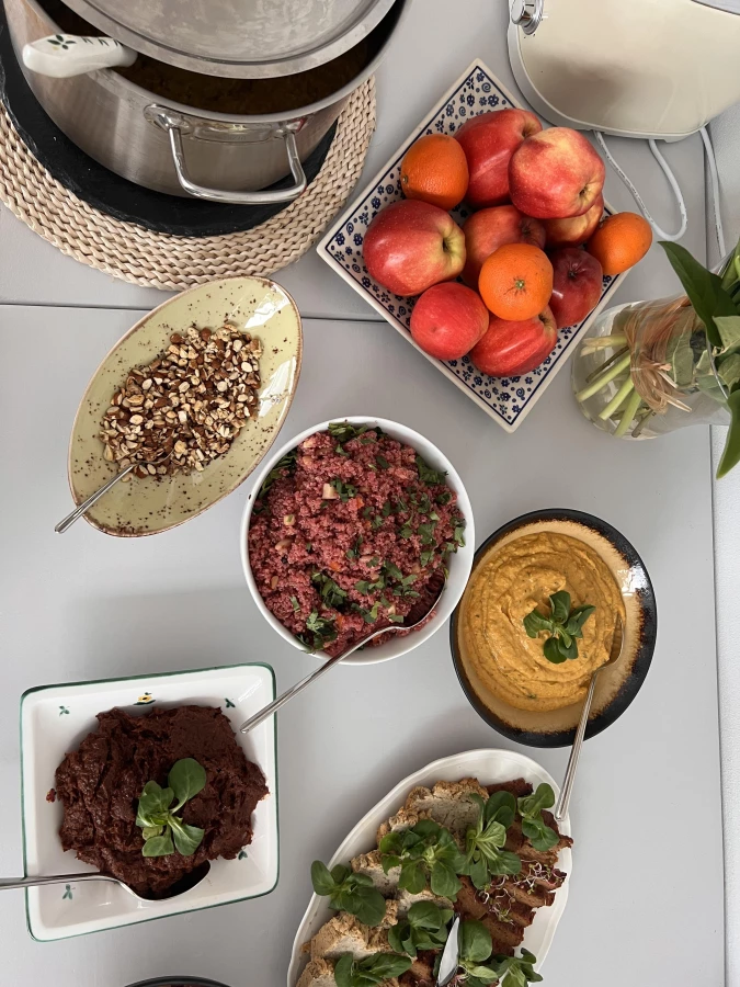 Dieta wegetariańska jest u nas standardem i wliczona jest w cenę pobytu. Gotujemy z serca – domowe, świeże posiłki z produktów z własnego ogrodu, pasieki i jajek od naszych kur.